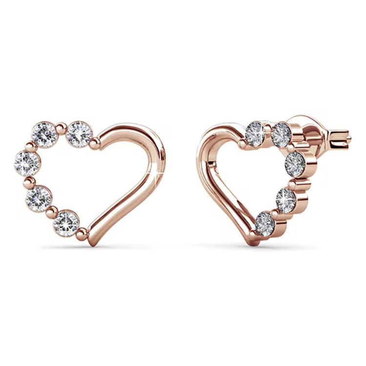Romantic heart-shaped crystal stud earrings, plated in 18K gold or rose gold. Perfect for weddings, anniversaries, or daily elegance.